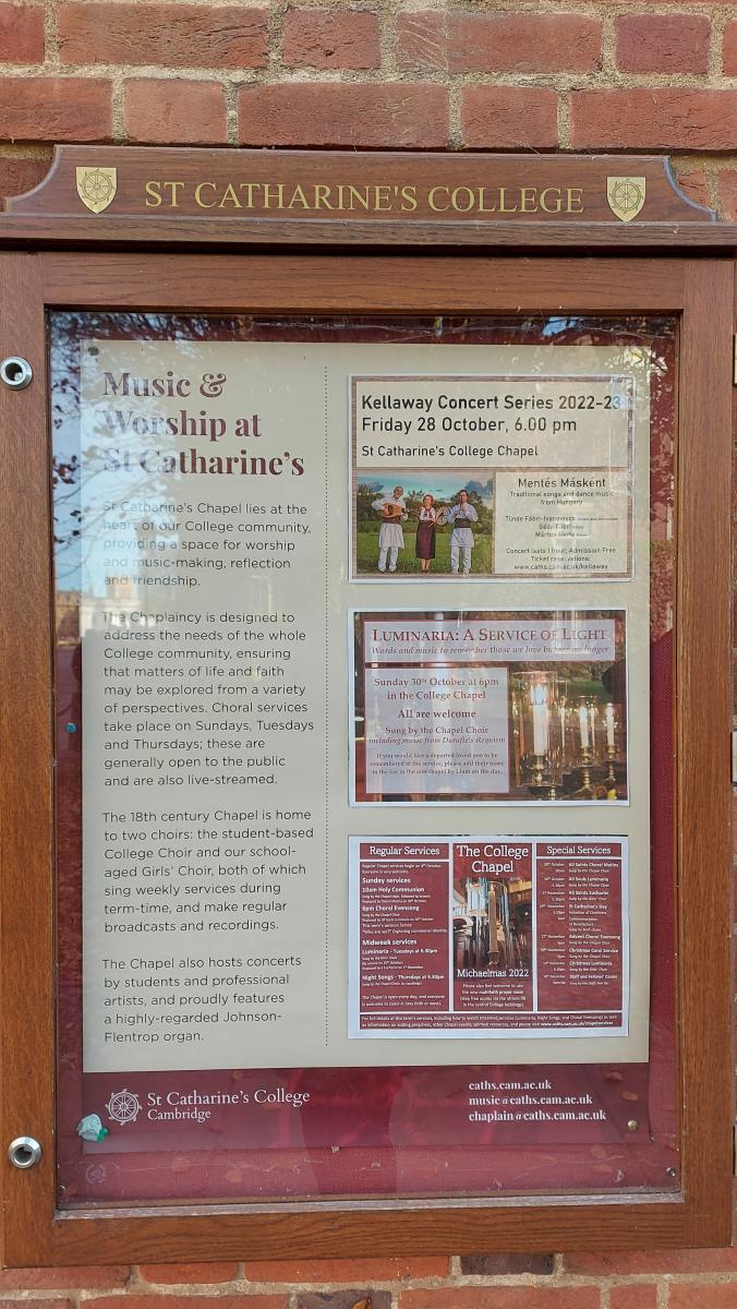A St Catharine’s College zenei igazgatója, Dr Edward Wickham karvezető örömteli visszaemlékezésben utalt a sok éves zenei kapcsolatunkra, melynek során növendékeink koncert csere programokban találkozhattak, alkothattak. A kivételes akusztikájú kápolnájában tartott koncerten különös tetszést aratott a Szent Lászlóhoz szóló historikus népének előadása, valamint a Kegyelmes Isten Balassi istenes vers népzenei feldolgozása. Régi kedvenc énekünk, Ideki e csenderbe…,  a közönség kérésére került a műsorba, amelyet ajándékként játszottunk.