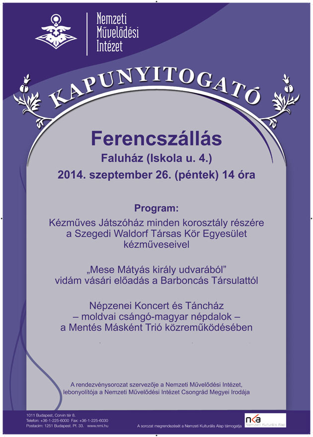A XIII. Kobzos-énekes-hegedűs-furulyás moldvai népzenei kurzus szakmai anyagának oktatása szeptember 19-én, pénteken 14 órakor kezdődik. A szálláshely elfoglalására, érkezésre 12 órától van lehetőség.