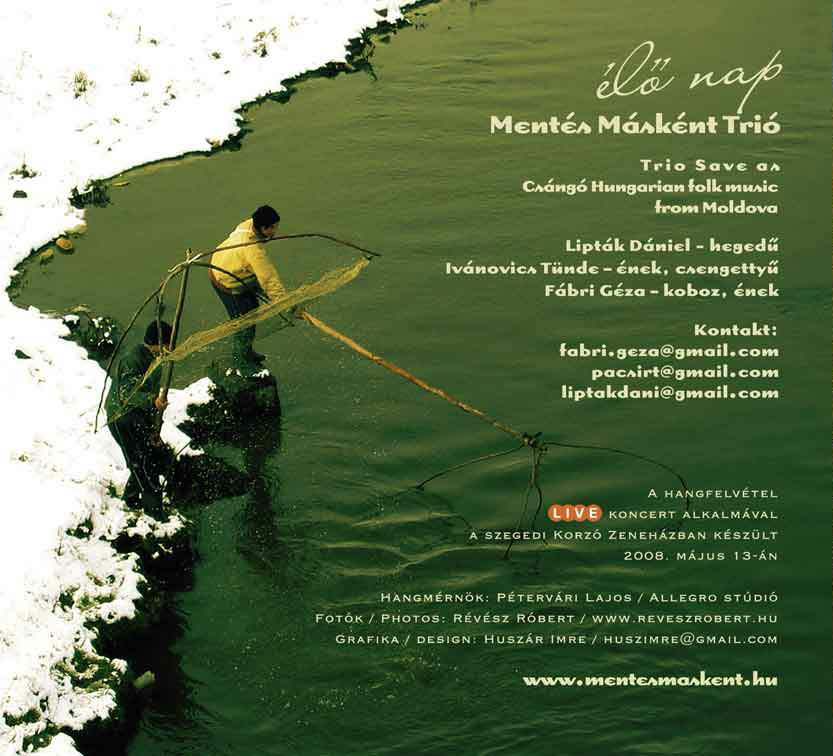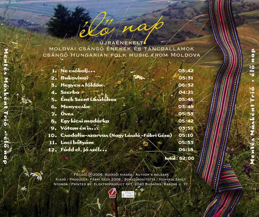 Élő nap – 2008. „Élő napja legyen!” – így kívánnak egészséget, áldást a moldvai csángó magyarok. Az áldás képe az élő nap – a zene pedig akkor lehet az áldás hordozója, ha élő zene marad. Ha hangfelvétel formájában is őrzi a személyességet, zenész és hallgató őszinte kapcsolatát. Ez a felvétel 2008 áprilisában, egy szegedi koncerten készült. A dallamokat, szövegeket, érzéseket jórészt a moldvai falvak ma is kinyomozható hagyományából tanuljuk gyűjtőútjaink során. Úgy muzsikáljuk őket, ahogy mi tudjuk – ahogy kezünkben mozdulnak, csíráznak, lélegeznek.